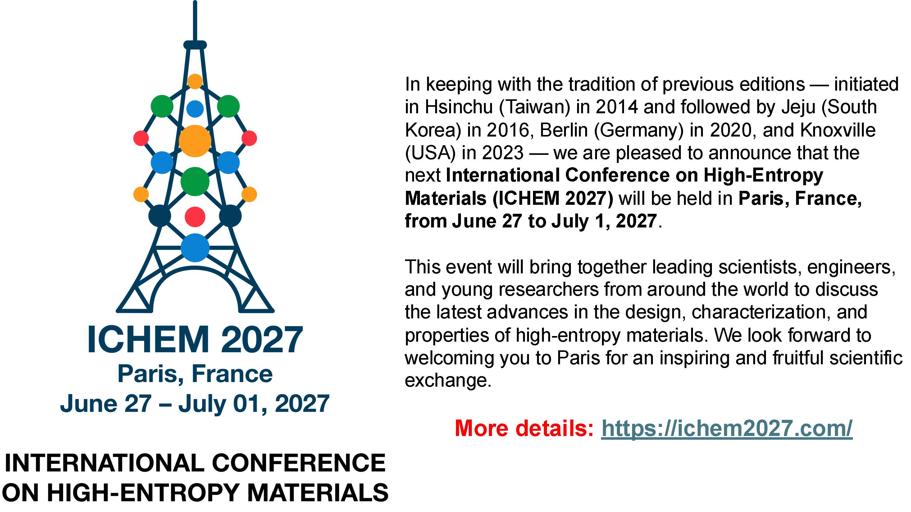 We cordially invite scholars and researchers worldwide to participate International Conference on High-Entropy Materials(ICHEM 2027) in Paris, France, from June 27 to July 1, 2027.